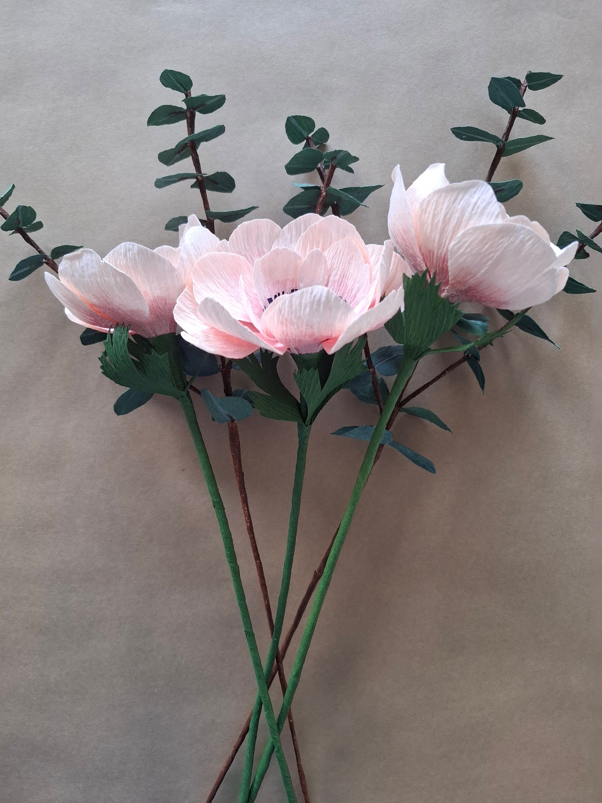 Soft, romantic, and timeless — this handcrafted bunch features three pastel crepe paper anemones paired with a couple of delicate eucalyptus stems. Each bloom and leaf is carefully shaped by hand from premium Italian crepe paper, creating a lifelike arrangement that lasts.